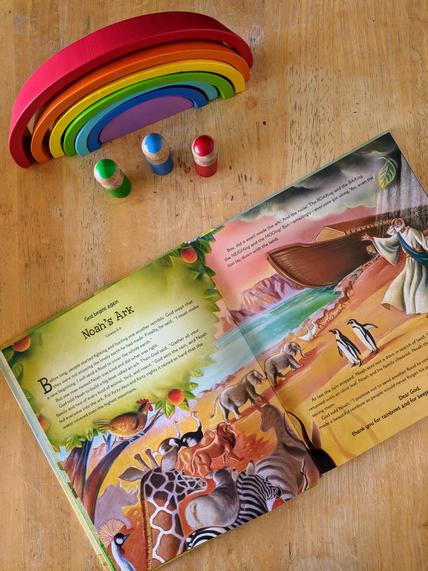 Children are full of questions and curiosities. When reading story Bibles, we can include time for those questions and curiosities. Use open-ended questions and wonder together, before, during, and after the story. Often, story Bible stories are short, leaving room for us to listen to children’s thoughts, observations, and wonderings.