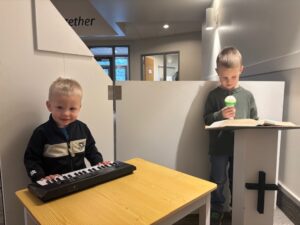 While the play elements have been intentionally placed there, it is not directed learning. Children are invited to use these tools as unprompted replications of what happens in a church sanctuary within the tiny walls of Play Church.